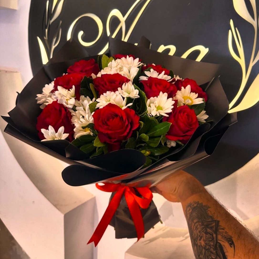 Beyaz Papatya ve Kırmızı Gül Buketi
